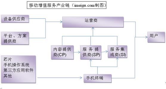 中國電信,中國移動,中國聯(lián)通是中國的三大電信運營商。移動增值服務和移動支付解決方案已構成了移動運營商的兩大收入來源。移動增值業(yè)務是包括所有增進移動用戶體驗的非話音服務,在中國目前主要的四大移動增值業(yè)務是:短信、彩信、WAP和彩鈴業(yè)務。移動增值業(yè)務的產(chǎn)業(yè)鏈如下圖所示: