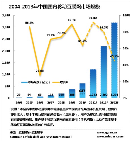 2010年中國國內移動互聯(lián)網市場規(guī)模達到637億元,較2009年上漲64.2%,增速放緩。除去流量費之外,移動互聯(lián)網服務收入達到342億元。