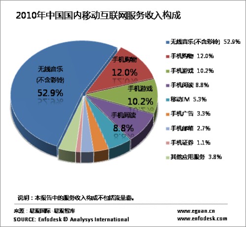 從收入構成看來,無線音樂、手機游戲、手機閱讀逐漸成為三大主要移動互聯(lián)網娛樂應用,手機購物增速明顯。