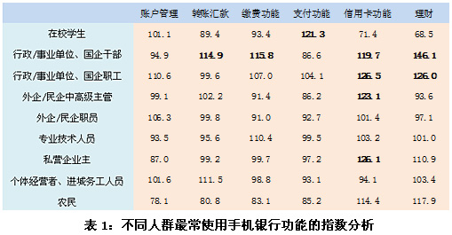 在本次調(diào)研中,對(duì)不同人群最常使用手機(jī)銀行功能的指數(shù)分析表明,在校學(xué)生更傾向于經(jīng)常使用手機(jī)銀行支付功能,較少使用手機(jī)理財(cái)功能;行政/事業(yè)單位、國企干部更傾向于使用手機(jī)銀行的轉(zhuǎn)賬匯款功能、繳費(fèi)功能、信用卡功能和理財(cái)功能,尤其是理財(cái)功能;行政/事業(yè)單位、國企職工經(jīng)常使用信用卡功能和理財(cái)功能的傾向性也非常明顯;外企/民企中高級(jí)主管則更傾向于經(jīng)常使用信用卡功能;私營企業(yè)主經(jīng)常使用手機(jī)銀行信用卡功能的傾向性顯著。