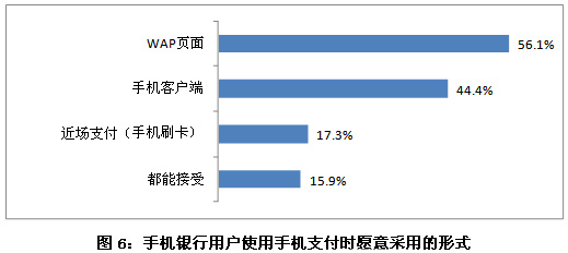 另外,手機(jī)銀行用戶使用手機(jī)支付時(shí),首選的是WAP頁面,56.1%的用戶更愿意采用這種形式。其次是手機(jī)客戶端,其比例為44.4%。近場支付(手機(jī)刷卡)這樣支付形式較為新穎,愿意使用的用戶比例僅占17.3%。此外,有15.9%的人以上三種方式都能接受。