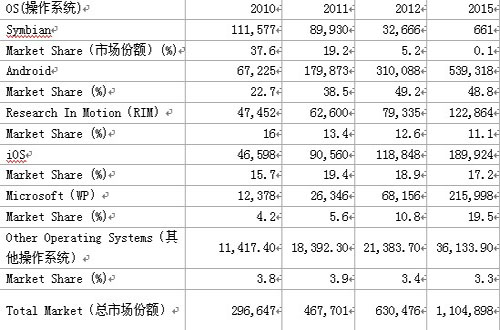 預(yù)計(jì)到2011年底,Android系統(tǒng)將在全球操作系統(tǒng)市場(chǎng)中占據(jù)38.5%的份額,超過(guò)Symbian系統(tǒng),預(yù)計(jì)Symbian將達(dá)到19.2%的市場(chǎng)份額。蘋果的iOS系統(tǒng)將在2011年成為第二大受歡迎的操作系統(tǒng),占據(jù)19.4%的市場(chǎng)份額,位列第三位的是 RIM (13.4%),第四位是微軟 WP(5.6%)。