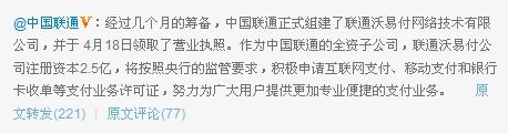 4月22日上午消息,中國聯(lián)通昨日在新浪微博上宣布,中國聯(lián)通正式組建了聯(lián)通沃易付網(wǎng)絡(luò)技術(shù)有限公司,并于4月18日領(lǐng)取了營業(yè)執(zhí)照,公司注冊(cè)資本2.5億。