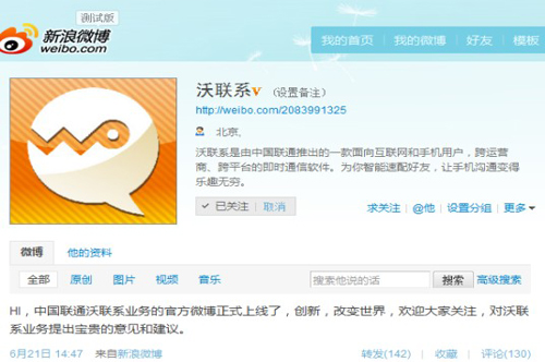 昨日下午,中國聯(lián)通“沃聯(lián)系”業(yè)務(wù)官方微博正式上線,而在稍后晚間,中國聯(lián)通官方微博也對(duì)此微博進(jìn)行推介,并稱“中國聯(lián)通即將推出一款面向互聯(lián)網(wǎng)和手機(jī)用戶,跨運(yùn)營商、跨平臺(tái)的即時(shí)通信軟件‘沃聯(lián)系’。為幫助用戶朋友更好了解和使用這款即將上線的產(chǎn)品,中國聯(lián)通沃聯(lián)系產(chǎn)品組現(xiàn)已開通@沃聯(lián)系新浪官方微博,敬請(qǐng)關(guān)注。”