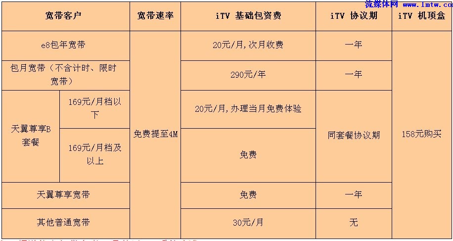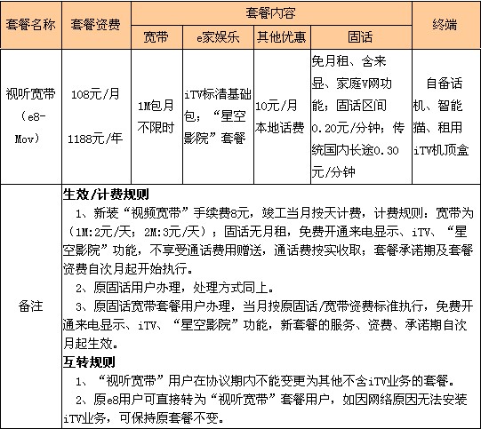 單獨(dú)辦理iTV,資費(fèi)30元/月;辦理4Me8套餐每月立減10元;辦理4Me9套餐和e家尊享套餐免費(fèi)贈送。(資費(fèi)以當(dāng)?shù)貭I業(yè)廳為準(zhǔn))