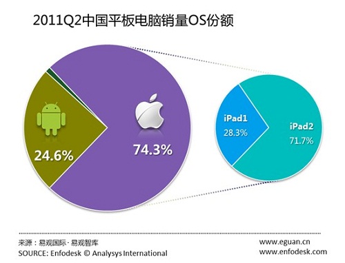 2011年第2季度iPad在平板電腦銷量份額跌破75%