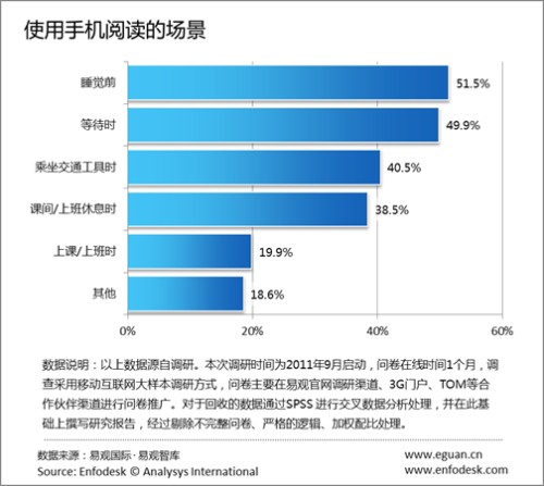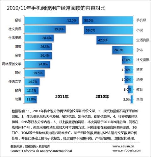 據(jù)易觀國際(Analysys International)最新報告《2011年中國手機(jī)閱讀市場用戶研究報告》(以下簡稱《報告》)研究發(fā)現(xiàn),報紙、生活資訊、社交資訊等類微內(nèi)容超越文學(xué)作品等長內(nèi)容成為手機(jī)閱讀用戶的習(xí)慣性閱讀內(nèi)容。
