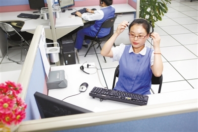 昨日,中國聯(lián)通二區(qū)分公司內(nèi),接線員郭婷玉在為打進(jìn)電話的市民處理完預(yù)約掛號服務(wù)后摘下耳機。