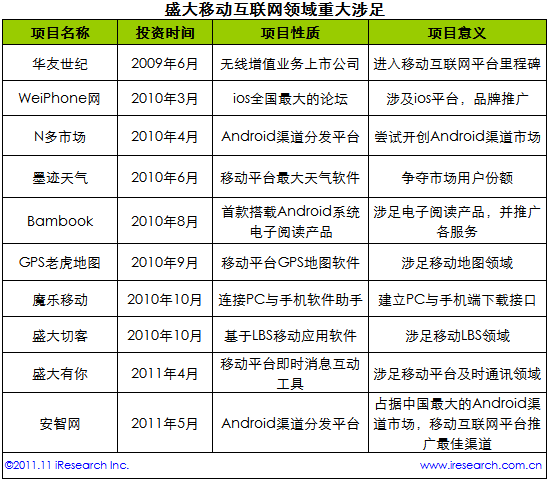 根據(jù)艾瑞咨詢整理的數(shù)據(jù)認(rèn)為,盛大一向秉持這“產(chǎn)業(yè)布局比產(chǎn)品開(kāi)發(fā)更重要”的想法,縱觀盛大在幾年中對(duì)移動(dòng)互聯(lián)網(wǎng)的產(chǎn)業(yè)鏈建立,投資及開(kāi)發(fā)項(xiàng)目可謂是星光奪目。