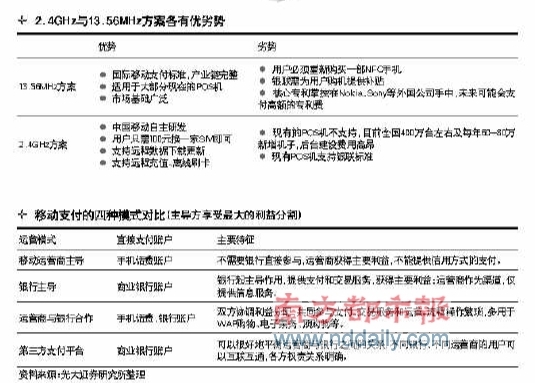 對此,國金證券發(fā)布了一份研究報告稱,相對于13 .56MHz方案而言,2.4GHz方案在推廣上有先天的優(yōu)勢。畢竟13.56M H z方案必須對手機重新設(shè)計,需要等待手機產(chǎn)業(yè)鏈對13.56M H z的逐步支持,時間周期較長;同時,更換13.56M H z手機帶來的重置成本無論是由用戶承擔(dān)還是由運營商承擔(dān)都是一筆高額的費用,推廣難度較高。而2.4G H z方案僅需更換SIM卡便可完成對手機的改造,不用等待終端產(chǎn)業(yè)鏈的成熟;同時改造成本低,便于運營商進行促銷推廣。