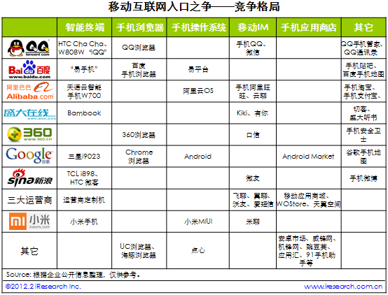 2011年,移動互聯(lián)網(wǎng)領(lǐng)域發(fā)展熱度很高,競爭激烈。艾瑞咨詢整理發(fā)現(xiàn),移動端的“用戶入口”成為傳統(tǒng)互聯(lián)網(wǎng)巨頭、移動運營商和移動互聯(lián)網(wǎng)企業(yè)競爭的聚焦點。這充分體現(xiàn)出,第一,移動互聯(lián)網(wǎng)的發(fā)展前景好,第二,移動互聯(lián)網(wǎng)目前仍處在用戶積累和行為培養(yǎng)的過程。