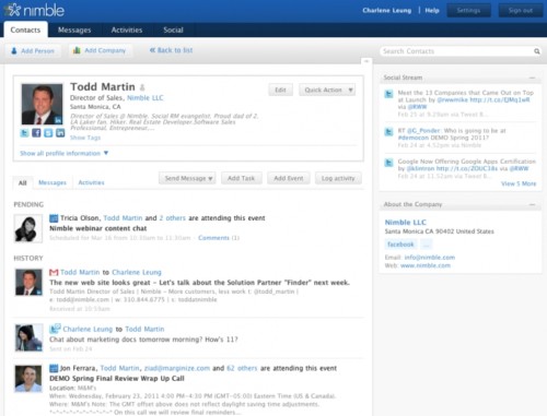 在一切皆可社會化的今天,客戶關系管理(CRM)服務的社交色彩也開始變得越來越濃。該領域內的創(chuàng)業(yè)公司Nimble最近升級了它們的服務,升級后的Nimble 2.0版更加強調社交信息的聚合管理,試圖給側重“信息輸入”的CRM服務領域帶來新變化。