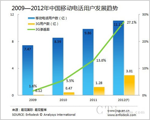 EnfoDesk易觀智庫分析認(rèn)為,從手機(jī)普及程度的趨勢(shì)來看,移動(dòng)電話用戶的增長(zhǎng)將逐漸減緩,預(yù)計(jì)2012年將達(dá)11.1億。