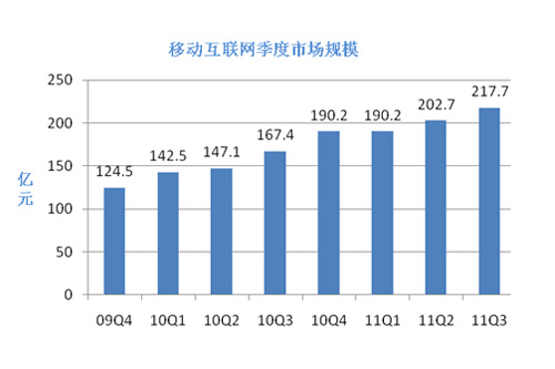 上圖是易觀國際發(fā)布的移動互聯(lián)網(wǎng)的相關(guān)數(shù)據(jù),數(shù)據(jù)截止到2011年第三季度,該圖顯示,2009年全球經(jīng)濟復蘇之后,移動互聯(lián)網(wǎng)業(yè)務(wù)收入一直保持著良好的增長狀態(tài),最新數(shù)據(jù)表明,2011年移動互聯(lián)網(wǎng)的整體市場規(guī)模已達到851億,遠超過2010年的637億,增長率將近33.6%,在移動互聯(lián)網(wǎng)業(yè)務(wù)子領(lǐng)域中,表現(xiàn)最突出的是移動電子商務(wù),與2009年相比較,移動電子商務(wù)所占比例由3%直線增長到11%。但是在手機閱讀和手機游戲方面則表現(xiàn)平平,有較大的增長空間。預計2012年3G用戶規(guī)模將增長到6億,將會超過互聯(lián)網(wǎng)用戶數(shù)量,智能機以及移動互聯(lián)網(wǎng)還會保持或者超過2011年的增長速率。