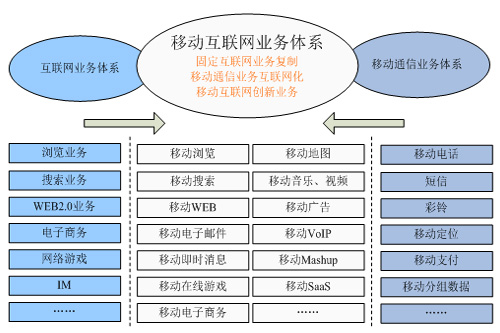 根據(jù)工信部相關(guān)信息,移動互聯(lián)網(wǎng)的業(yè)務(wù)體系主要包括三大類,如下圖所示:一是固定互聯(lián)網(wǎng)的業(yè)務(wù)向移動終端的復制,從而實現(xiàn)移動互聯(lián)網(wǎng)與固定互聯(lián)網(wǎng)相似的業(yè)務(wù)體驗,這是移動互聯(lián)網(wǎng)業(yè)務(wù)的基礎(chǔ)。二是移動通信業(yè)務(wù)的互聯(lián)網(wǎng)化,如Skype推出的移動VOIP業(yè)務(wù)、中國移動的飛信業(yè)務(wù)等。三是結(jié)合移動通信與互聯(lián)網(wǎng)功能而進行的有別于固定互聯(lián)網(wǎng)的業(yè)務(wù)創(chuàng)新,這是移動互聯(lián)網(wǎng)業(yè)務(wù)發(fā)展方向。對創(chuàng)業(yè)者而言,移動互聯(lián)網(wǎng)的業(yè)務(wù)創(chuàng)新關(guān)鍵是如何將移動通信的網(wǎng)絡(luò)能力與互聯(lián)網(wǎng)的網(wǎng)絡(luò)與應(yīng)用能力進行聚合,從而創(chuàng)新出適合移動終端的互聯(lián)網(wǎng)業(yè)務(wù),如移動Web2.0業(yè)務(wù),如微博、移動位置類互聯(lián)網(wǎng)業(yè)務(wù)等。