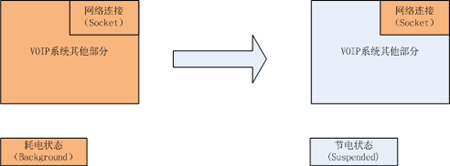 2、程序配置用于 VOIP 業(yè)務(wù)的網(wǎng)絡(luò)連接(Socket),告知系統(tǒng),在程序進程被調(diào)度到“掛起(Suspended)”狀態(tài)時該特殊的網(wǎng)絡(luò)連接需要被系統(tǒng)接管,因此,此時網(wǎng)絡(luò)連接仍然是活動的。當(dāng)網(wǎng)絡(luò)連接有新的數(shù)據(jù)到達(dá)的時候,程序?qū)摹皰炱穑⊿uspended)” 狀態(tài)被喚醒到“后臺 (Background)”狀態(tài),如果是個來電事件,VOIP應(yīng)用則發(fā)起一個本地提醒事件,此時用戶可以在設(shè)備的界面上看到來電提醒,如果用戶選擇接聽來電,則 VOIP 應(yīng)用被調(diào)度到前端的“活動 (Active)”狀態(tài)直接與用戶交互,否則,回退到低電的“掛起(Suspended)”狀態(tài)。下圖可以看到左圖是傳統(tǒng)的 VOIP 應(yīng)用,在“待機”狀態(tài)下整個程序都運行在耗電的“后臺 (Background)”狀態(tài),右圖是蘋果的 VOIP 實現(xiàn),僅僅網(wǎng)絡(luò)連接運行在耗電的“后臺 (Background)”狀態(tài)。其余系統(tǒng)部分運行在低電的“掛起(Suspended)”狀態(tài)。