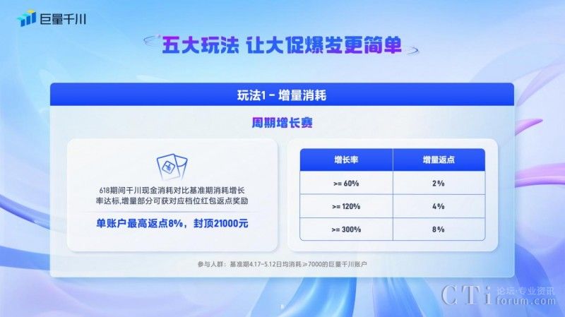一、「周期增長賽」:針對在618好物節(jié)期間現(xiàn)金消耗對比基準(zhǔn)期消耗增長率達(dá)標(biāo)的商家,增量部分可獲得對應(yīng)檔位紅包返點獎勵,單賬戶最高返點8%,封頂21000元。