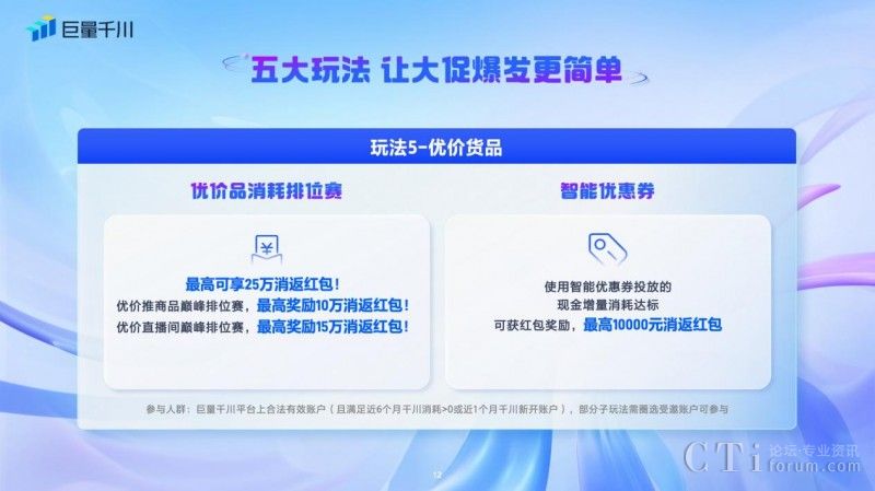 五、「優(yōu)價貨品玩法 」:優(yōu)價貨品商家也可以參與優(yōu)價品消耗排位賽和智能優(yōu)惠券活動玩法。平臺推出優(yōu)價推商品和優(yōu)價直播間巔峰排位賽,商家累計最高可享25萬消返紅包。對于使用智能優(yōu)惠券投放的商家,現(xiàn)金增量消耗達(dá)標(biāo)可獲得最高10000元的消返紅包獎勵。