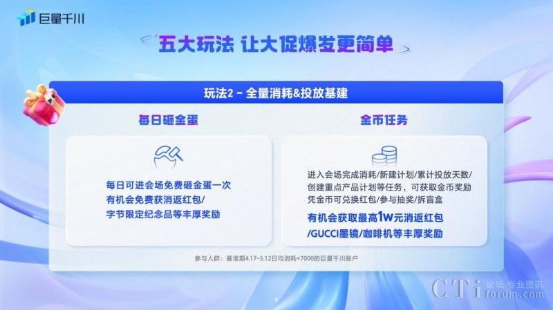 二、「每日砸金蛋&金幣任務(wù)」:針對在618好物節(jié)期間現(xiàn)金消耗對比基準(zhǔn)期消耗增長率未達(dá)標(biāo)的商家,可參與每日砸金蛋和金幣任務(wù)。商家每日可進(jìn)入會場免費砸金蛋一次,就有機(jī)會免費獲得消返紅包和字節(jié)限定紀(jì)念品等獎勵。此外,商家進(jìn)入會場完成消耗/新建計劃/累計投放天數(shù)/創(chuàng)建重點產(chǎn)品計劃等任務(wù),可獲取金幣獎勵,憑金幣可兌換紅包、參與抽獎和拆盲盒等豐厚獎勵,最高可得10000元消返紅包。