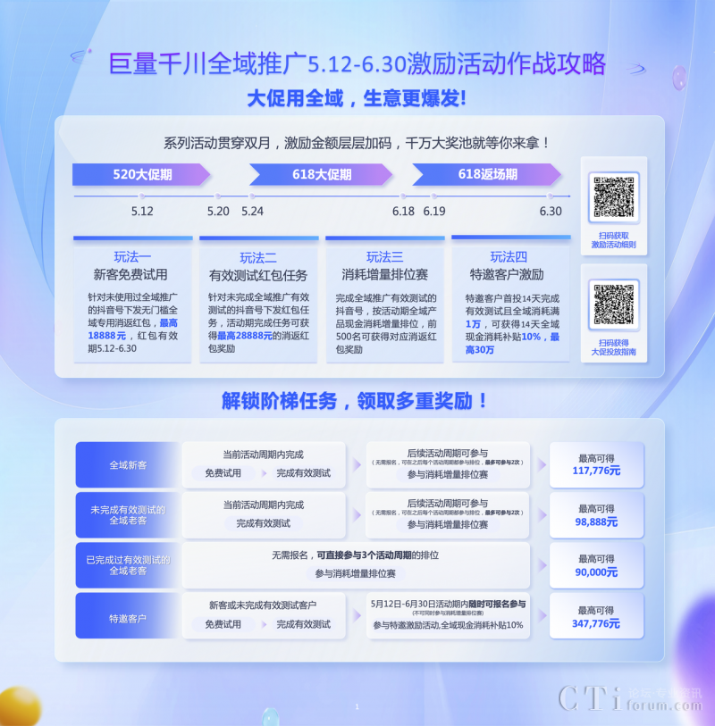 在此次巨量千川618好物節(jié)期間,全域推廣系列活動貫穿雙月,激勵金額層層加碼,更有多重獎勵,獎池金額累積千萬。全域推廣針對全域新客發(fā)放高達(dá)18888元的全域推廣專屬紅包;對于未完成全域有效測試的商家在活動期完成有效測試任務(wù)可獲得最高28888元的消返紅包;以及參與全域推廣消耗排位賽,最高可得50000元消返紅包;對于特邀客戶首投14天完成有效測試且全域消耗滿1萬,可獲得14天全域現(xiàn)金消耗補(bǔ)貼10%,最高達(dá)30萬。