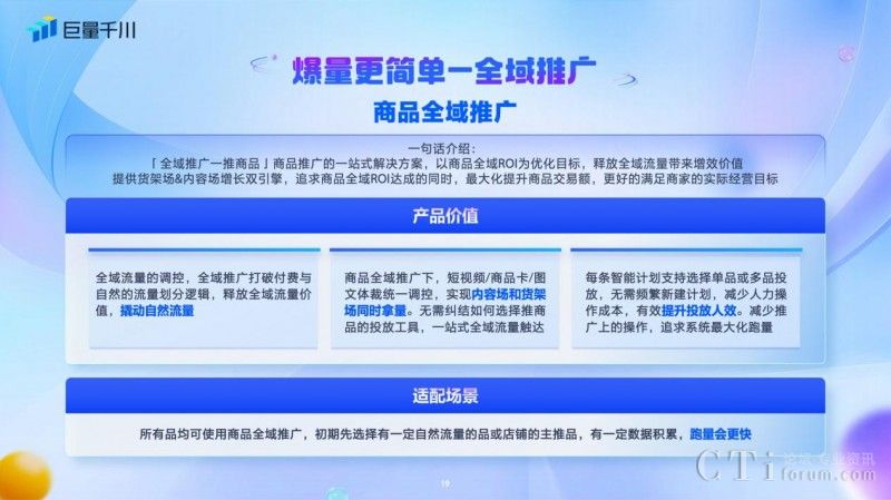 此外,商品全域推廣為商品推廣提供一站式解決方案,是以商品全域ROI為優(yōu)化目標(biāo),釋放全域流量帶來的增效價值,提供貨架場、內(nèi)容場增長雙引擎,幫助客戶在追求商品全域ROI達(dá)成的同時,最大化提升商品交易額,更好的滿足客戶的實際經(jīng)營目標(biāo)。在商品全域推廣下,短視頻/商品卡/圖文體裁統(tǒng)一調(diào)控,無需糾結(jié)選擇推廣商品的投放工具,一站式全域流量觸達(dá)。