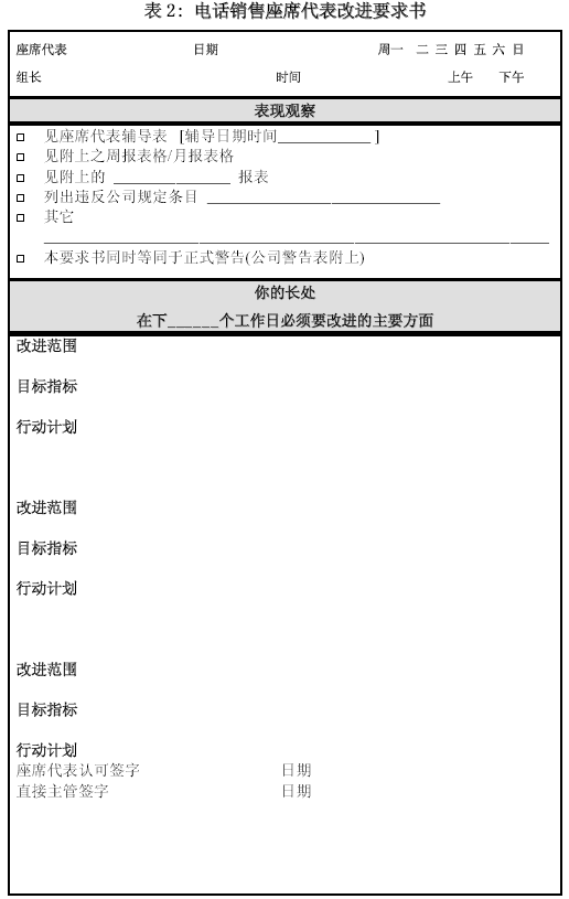 。。這里所列的兩張輔導(dǎo)表應(yīng)該是主管、質(zhì)檢與輔導(dǎo)師最常見(jiàn)的工具。那種無(wú)法對(duì)通話內(nèi)容進(jìn)行具體、詳盡分析,或者輔導(dǎo)人自己也定義不清, 不能給出示范與明確改進(jìn)方向的管理絕對(duì)不是專業(yè)的管理。在這類輔導(dǎo)表之外,可以根據(jù)通話的評(píng)價(jià)和其它一些紀(jì)律觀察,設(shè)計(jì)一種“改進(jìn)要求表”,將根據(jù)表現(xiàn)觀察后制定的改進(jìn)要求詳細(xì)列出。如果公司有書面警告一類的程序要求,也可揉合進(jìn)改進(jìn)要求書。