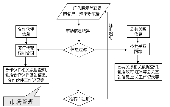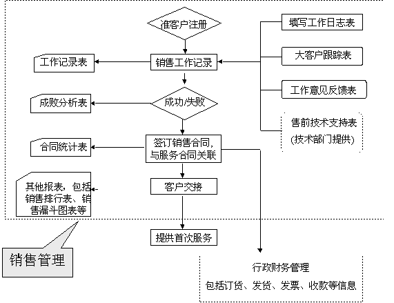 選定適合中小企業(yè)應(yīng)用的CRM軟件 ----啟利CRM ( ChineseCRM.Net ),并由啟利公司負(fù)責(zé)提供實(shí)施服務(wù)。CRM系統(tǒng)的主要模塊包括:市場管理、銷售管理、服務(wù)管理、行政管理,各模塊主要業(yè)務(wù)流程圖如下: