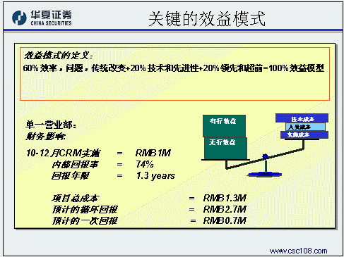 華夏證券經(jīng)紀(jì)業(yè)務(wù)總部的姚磊作為唯一的成功應(yīng)用案例代表,主要是和與會(huì)的金融機(jī)構(gòu)分享在客戶關(guān)系管理規(guī)劃方面的一些成功經(jīng)驗(yàn)。華夏證券認(rèn)為,對(duì)于證券公司的經(jīng)紀(jì)業(yè)務(wù)來(lái)講,客戶關(guān)系管理的主要目標(biāo)應(yīng)該是把客戶關(guān)系管理系統(tǒng)的核心功能融入開戶、交易、服務(wù)、咨詢等四個(gè)與客戶互動(dòng)的過(guò)程之中,比如:客戶資料規(guī)戶整合形成統(tǒng)一的客戶號(hào),管理客戶交易偏好和產(chǎn)品偏好上的變化,配合多種渠道建立一對(duì)一銷售流程,客戶終身價(jià)值管理。在風(fēng)險(xiǎn)控制方面,華夏證券同樣貢獻(xiàn)了寶貴的經(jīng)驗(yàn),在這方面他們認(rèn)為最重要的方面是要做好高層領(lǐng)導(dǎo)的灌輸和培訓(xùn)工作,讓企業(yè)的高層領(lǐng)導(dǎo)對(duì)于客戶關(guān)系管理有一個(gè)正確的理解,從而對(duì)于項(xiàng)目的投資有一個(gè)合理的預(yù)期和實(shí)證,通俗一點(diǎn)說(shuō),就是首先為整個(gè)項(xiàng)目找一個(gè)合適的發(fā)起人。第二點(diǎn)要注意,要有專業(yè)的項(xiàng)目管理隊(duì)伍,這其實(shí)就是集成商選擇方面的風(fēng)險(xiǎn)。除此之外,還要對(duì)項(xiàng)目要有一個(gè)明確的定義,關(guān)注每一步提交的結(jié)果,在項(xiàng)目過(guò)程中就隨時(shí)發(fā)現(xiàn)問(wèn)題、解決問(wèn)題。
