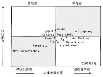 E.piphany依靠其分析能力和個性化方面的優(yōu)勢,仍然是該市場的領導者。但是其領先地位開始受到了強有力的挑戰(zhàn)。其中,Siebel對其領先地位構成很大的威脅,正在逐步邁入該市場的領導者行列。Blue Martini Software由于受到其零售和生產(chǎn)能力方面的限制,目前依然稍稍遜色于E.piphany。