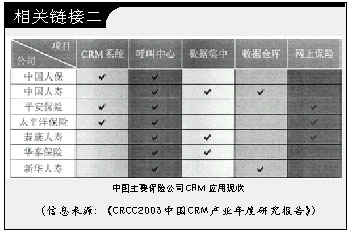 據(jù)某IT媒體2002年末的調(diào)研,只有不到1/5的中國保險公司擁有客戶關(guān)系管理系統(tǒng),但是近六成的保險公司計劃在近期內(nèi)實施CRM;另一份調(diào)查則顯示中國保險業(yè)過去3年的IT投入平均達(dá)到9.36億元,幾乎所有的保險公司都在從不同側(cè)面開展CRM建設(shè)。CRM在中國保險業(yè)的應(yīng)用,到底是處于落伍還是冒進(jìn)狀態(tài),成為一個意味深長的話題。