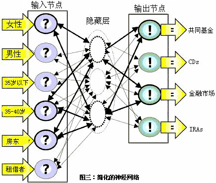 假設(shè)該集團的數(shù)據(jù)組包括了100000個現(xiàn)有和潛在的顧客。數(shù)據(jù)組中所有成員至少滿足一個列示于每個輸出節(jié)點邊上的特征條件,比如說,他們的年齡小于35歲或者是在35-40之間,男性或者女性,房東或者租借人。BPN從所有的輸入節(jié)點中獲得數(shù)據(jù),并且以此編譯一個預測型模型。這個簡單的模型告訴使用者,年齡在35-40歲之間的男性房東最有可能購買共同基金和金融市場產(chǎn)品。這是BNP能預測的信息。