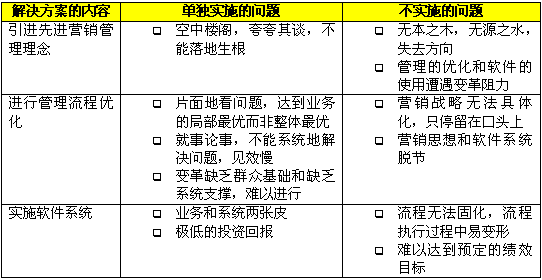 在CRM出現(xiàn)以前,企業(yè)為了解決市場(chǎng)、銷售和服務(wù)方面的問題,更好地吸引、獲得、保留和發(fā)展客戶,采取了各種方式,比如使用一套分銷管理的解決方案,或者請(qǐng)"點(diǎn)子公司"出謀劃策,或者尋求某個(gè)具體業(yè)務(wù)的優(yōu)化。以上這些做法往往只能完成局部的改進(jìn),或取得短期的效果,無法形成長期和整體的競(jìng)爭優(yōu)勢(shì)。原因就在于這些解決方案都只提供了片面的、局部的解決方案,"頭痛醫(yī)頭,腳痛醫(yī)腳"不能綜合管理理念、業(yè)務(wù)流程和技術(shù)應(yīng)用這三個(gè)方面,系統(tǒng)地分析和解決問題。下表中分析了這些解決方案單獨(dú)實(shí)施或者不實(shí)施會(huì)帶來什么問題。