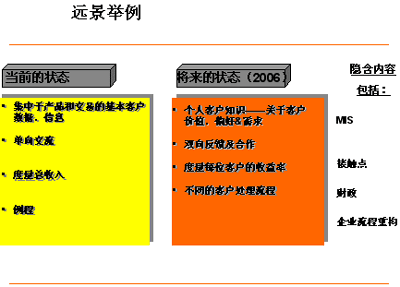 在評估當(dāng)前情況與遠景,資源需求,癥結(jié),極限以及鋪就路標(biāo)和里程碑的關(guān)系時,實施展望和差距分析會議是十分重要的。取決于你對CRM遠景的定義——無論是它將成為一個能夠給你一把競爭利刃的企業(yè)策略 (類似的例子有Citicorp,Dell,F(xiàn)ord Motors) 或僅僅只是一個讓你更出眾的營銷項目——這邁出的第一步在你選擇CRM方法論的過程中都必將起到舉足輕重的作用。一個核心的方法論必須能夠支持企業(yè)大部分的業(yè)務(wù)和流程需求,如MIS;客戶體驗管理;接觸點管理;收益率管理等等。