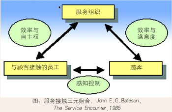 在Bateson的“三元組合”模型中,顧客通過“與顧客接觸的員工”感受到服務(wù)提供商提供的服務(wù),從而對(duì)服務(wù)組織的服務(wù)效率和滿意度做出自己的評(píng)價(jià)。這種情況下,顧客的“滿意”與“不滿”是通過“與顧客接觸的員工”獲得的,但服務(wù)感知同時(shí)反映了服務(wù)組織給予“與顧客接觸的員工”的自主權(quán)和“員工的接受程度”。