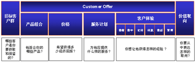 造成這樣的結(jié)果, 關(guān)鍵在于僅僅用產(chǎn)品或服務(wù), 無法表達(dá)出客戶對企業(yè)完整的價值取向. 我們還需要更豐富的管理理念來表達(dá)出企業(yè)對客戶所有的價值提供. 這一概念其實早已由埃森哲提出, 我們稱之為”Customer Offer”. 其內(nèi)涵在國內(nèi)的實際項目中已經(jīng)得到實踐的檢驗, 并取得良好的效果(該項目為某國內(nèi)領(lǐng)先的電信運(yùn)營企業(yè)的CRM項目, 于2003年底完成).
