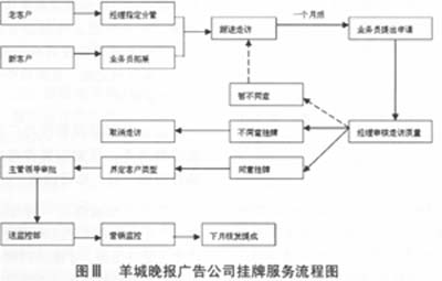 監(jiān)控部門(mén)負(fù)責(zé)對(duì)市場(chǎng)和公司業(yè)務(wù)的監(jiān)控。市場(chǎng)監(jiān)控的核心是同城媒體的廣告業(yè)務(wù)監(jiān)測(cè),監(jiān)控部門(mén)搜集同城媒體廣告版面投放的明細(xì)數(shù)據(jù),并以此做出詳細(xì)分析,為管理層提供監(jiān)測(cè)報(bào)表;同時(shí)評(píng)價(jià)客戶在廣告市場(chǎng)上的最新表現(xiàn),掌握新進(jìn)客戶、忠實(shí)客戶、拓展客戶等形態(tài)的變化。廣告公司對(duì)客戶的跟進(jìn)是通過(guò)一線業(yè)務(wù)員的掛牌服務(wù)實(shí)現(xiàn)的(見(jiàn)圖Ⅲ),營(yíng)銷(xiāo)監(jiān)控就是對(duì)業(yè)務(wù)人員的工作進(jìn)行實(shí)時(shí)掌控,以此劃分客戶服務(wù)資源,協(xié)調(diào)業(yè)務(wù)營(yíng)銷(xiāo)秩序。監(jiān)控部門(mén)有一整套掛牌、監(jiān)控的規(guī)定,可對(duì)掛牌的業(yè)務(wù)人員實(shí)施業(yè)務(wù)營(yíng)銷(xiāo)監(jiān)控,作為進(jìn)行業(yè)務(wù)提成核算的重要依據(jù)。在監(jiān)控流程中,掛牌的《申請(qǐng)報(bào)表》、《客戶資料更改報(bào)表》、《業(yè)務(wù)計(jì)劃報(bào)表》、《業(yè)務(wù)營(yíng)銷(xiāo)報(bào)表》等一系列報(bào)表不但保證了客戶服務(wù)的質(zhì)量,也為客戶數(shù)據(jù)庫(kù)提供信息來(lái)源。監(jiān)控部門(mén)還以電話訪問(wèn)方式保證資料的實(shí)時(shí)性和真實(shí)性,同時(shí)進(jìn)行客戶滿意度調(diào)查。當(dāng)這些資料由業(yè)務(wù)人員匯集到數(shù)據(jù)庫(kù),維護(hù)客戶則從業(yè)務(wù)員的個(gè)人行為上升至公司行為,大大提高了公司掌控客戶服務(wù)的效率,確保了客戶服務(wù)的效果。