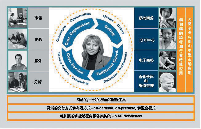 mySAP CRM不僅包含了企業(yè)市場營銷、銷售、服務(wù)、分析等功能,還通過渠道伙伴、現(xiàn)場和移動商務(wù)、交互中心、電子商務(wù)等各種交互渠道形成完整的閉環(huán)式設(shè)計(jì)的解決方案。在提供深入的行業(yè)應(yīng)用和傳統(tǒng)的部署方式的同時,mySAP