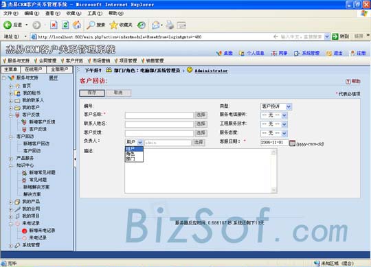 頁(yè)面的最頂端將本系統(tǒng)分為服務(wù)與支持、合同管理、客戶開拓、市場(chǎng)營(yíng)銷、項(xiàng)目管理、銷售管理六板塊進(jìn)行陳列以方便管理,同時(shí)左側(cè)是詳細(xì)的樹形結(jié)構(gòu)圖,所有功能一目了然。本系統(tǒng)實(shí)現(xiàn)了將不同業(yè)務(wù)、客服人員涉及的客戶資料進(jìn)行了全面而且條理的整理匯集,整合團(tuán)隊(duì)的力量提供完善的服務(wù)。