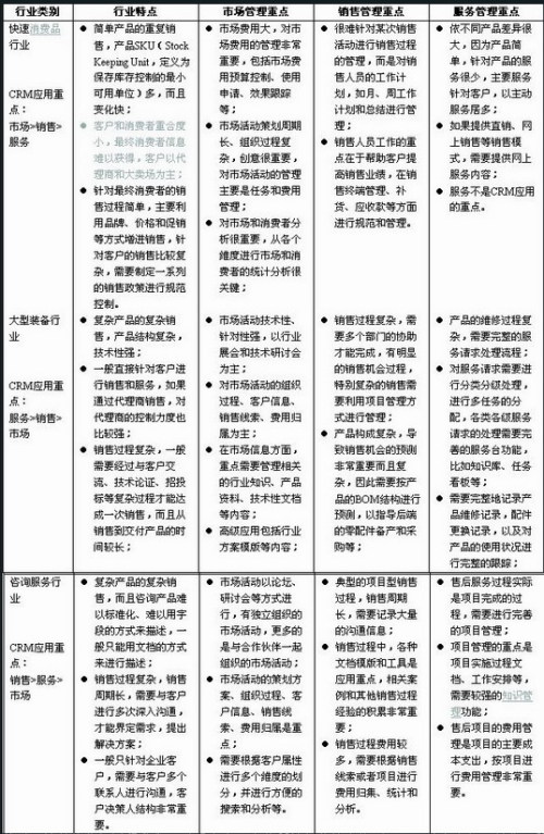 從以上簡單的分析過程我們可以看出由于企業(yè)所處行業(yè)特點(diǎn)的不同,導(dǎo)致在市場、銷售和服務(wù)方面對(duì)CRM主要功能需求差別非常大。企業(yè)在實(shí)際選型過程中,還需要對(duì)行業(yè)再進(jìn)行細(xì)分分析,比如在快速消費(fèi)品中,洗滌用品行業(yè)和牛奶乳業(yè)行業(yè)在客戶服務(wù)的主要需求等方面就有比較大的差別,這些都需要細(xì)致的分析。