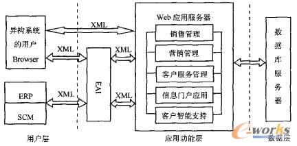 包括ERP、SCM等其他企業(yè)應(yīng)用在內(nèi)的所有的系統(tǒng)用戶與應(yīng)用功能層的數(shù)據(jù)交換均通過(guò)XMI數(shù)據(jù)進(jìn)行傳輸,從而大大減小了各種企業(yè)應(yīng)用系統(tǒng)間的通信阻力,為EAI提供了良好的通信平臺(tái)。Web用戶的客戶端只是“瘦小的”瀏覽器日_數(shù)量不受限制,不需要安裝專門的軟件,這使得凡可以接入Internet的用戶都可以方便、靈活地使用系統(tǒng),大大提升了系統(tǒng)用戶間溝通、協(xié)作的效率。此外,由于CRM應(yīng)用系統(tǒng)是在中央服務(wù)器上實(shí)施和維護(hù)的,對(duì)客戶端的要求遠(yuǎn)沒有C/S結(jié)構(gòu)那么高,集中的軟件實(shí)施和維護(hù)大大節(jié)約了企業(yè)的運(yùn)行成本和維護(hù)費(fèi)用。圖1描述的是筆者所要闡述的適應(yīng)網(wǎng)絡(luò)環(huán)境的基于Web的系統(tǒng)平臺(tái)架構(gòu),這并不意味著CRM應(yīng)用系統(tǒng)完全以這種方式運(yùn)行,事實(shí)上用戶接入CRM系統(tǒng)的方式是多種多樣的,系統(tǒng)還應(yīng)該提供電話、傳真、無(wú)線接入等多種接入接口。