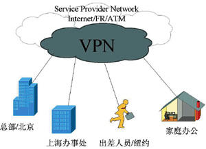 在如圖2所示的VPN 示意圖中,可以看出,VPN所賴以運(yùn)行的公網(wǎng)平臺可以包括各種實(shí)際的網(wǎng)絡(luò),例如IP網(wǎng)、幀中繼網(wǎng)、ATM網(wǎng),也可以就是因特網(wǎng)(Internet),因而也表明其網(wǎng)絡(luò)的范圍可以包括多個服務(wù)商。從地理范圍上看,VPN可以延伸到所有互相聯(lián)網(wǎng)的服務(wù)商所覆蓋的范圍。從用戶接入方式看,VPN可以包括服務(wù)商所提供的所有接入方式,如專線接入、撥號接入、無線連接等。