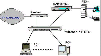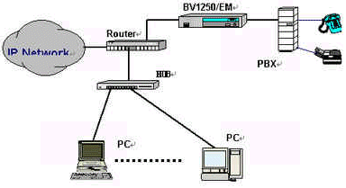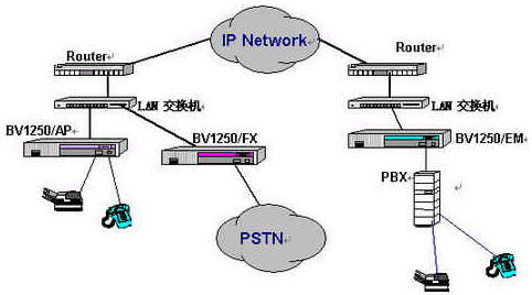 OKI公司的IVG BV1250互聯(lián)網(wǎng)絡(luò)IP電話語音網(wǎng)關(guān)就是一種非常好的選擇,完全基于H.323 Ver2.0協(xié)議,實(shí)現(xiàn)語音和傳真在因特網(wǎng)上傳輸。使用BV1250 進(jìn)行IP電話和IP FAX通信時(shí),可以感覺到與傳統(tǒng)的電話或傳真所提供的服務(wù)毫無區(qū)別。運(yùn)用BV1250,可通過互聯(lián)網(wǎng)(Internet/Intranet)將電話機(jī)、傳真機(jī)和PBX進(jìn)行互連,建立專用的IP電話網(wǎng)絡(luò)。BV1250使用的是靜態(tài)IP地址,因此不能將BV1250連接到使用DHCP(動態(tài)主機(jī)通信規(guī)程)的互聯(lián)網(wǎng)上。常用連接方式如下圖所示: