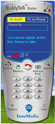 (如圖3),這個就是BuddyTalk的軟件界面。這象不象一個手機(jī)?上面的藍(lán)色部分是液晶屏。你可以選擇pc-to-pc或者pc-to-phone,下面是用來輸入電話號碼的一個空框,空框下面的部分是軟件顯示提示信息的,再下面是音量大小的顯示器。液晶屏的下面部分跟手機(jī)幾乎一樣,其中一個“search”,這是用來上網(wǎng)實(shí)現(xiàn)全球用戶數(shù)據(jù)庫搜索,一個“options”,各種設(shè)置可以在這里完成,“Memory”記錄的是你通話信息,以利快速撥號。