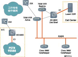 AS 5800 Dial Shelf上的E1接口直接連接客戶服務(wù)中心的Lucent公司G3R交換機(jī)。市行的語音網(wǎng)關(guān)Cisco AS 5300同樣通過高速串口接入幀中繼網(wǎng)絡(luò),與本地網(wǎng)絡(luò)完全隔離。市行申請的95588數(shù)字中繼線路(多采用ISDN