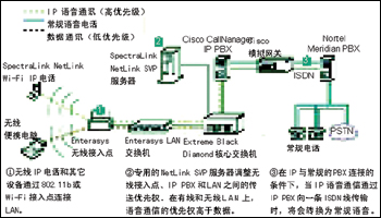 PBX,利用IP將一些遠(yuǎn)程設(shè)備與一臺(tái)Nortel的Meridian PBX連接起來(lái),構(gòu)成語(yǔ)音網(wǎng)絡(luò)。在USCUH選擇為醫(yī)護(hù)人員配發(fā)WLAN電話時(shí),兩個(gè)網(wǎng)絡(luò)合并到了一起。為保證語(yǔ)音質(zhì)量,醫(yī)院利用SpectraLink的NetLink