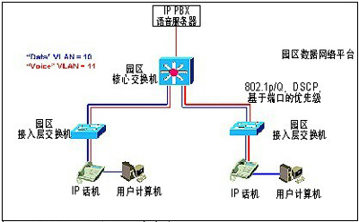 目前各個(gè)廠商的系列IP話機(jī)均提供2個(gè)以太網(wǎng)端口,一個(gè)連接網(wǎng)絡(luò)交換機(jī),一個(gè)可以連接用戶PC,與網(wǎng)絡(luò)交換機(jī)連接端口支持802.1Q/p,可以實(shí)現(xiàn)IP語音和用戶PC劃歸不同的VLAN,而且IP語音包會(huì)帶上第二層和第三層的優(yōu)先級(jí)標(biāo)記,可以和客戶具有QoS支持的數(shù)據(jù)網(wǎng)絡(luò)平臺(tái)結(jié)合,提高IP話音質(zhì)量。