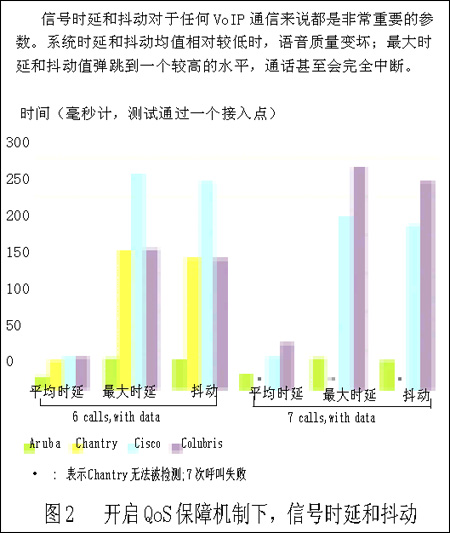而當我們通過一個接入點或交換機傳送6到7個并行VoIP呼叫時,尤其是加入了數據通信業(yè)務后,所有產品的系統(tǒng)性能顯著降低。另外,當開通7個并行VoIP呼叫和關閉QoS保障機制時,即使沒有加入數據業(yè)務, Colubris設備也幾乎都處于通話中斷的狀態(tài)。因此,我們無法得到任何測試數據(如圖1所示)。