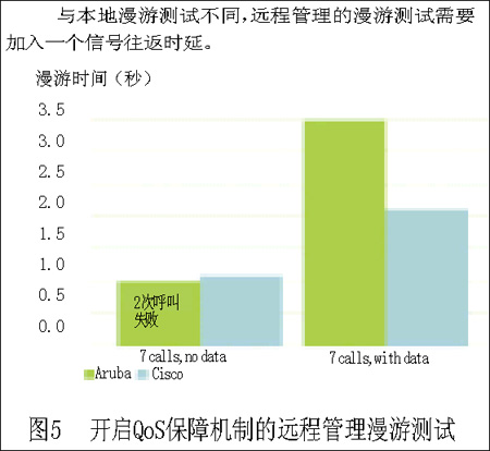 在沒有數據流業(yè)務接入時,兩個供應商的當地和遠程管理漫游時間是完全相同的(如圖5所示)。根據目前的數據來看,Aruba’s的本地漫游時間是1秒,而遠距離的地方漫游時間大約是3.5秒。而Cisco的設備在本地漫游的時間比長途漫游的時間長,這個結果和最初的設想正好相反。盡管我們不能解釋上述結果,但至少它能證實Cisco的結論。Cisco認為:接入點對客戶端的預認證,沒有對遠程管理的接入點產生不良影響。