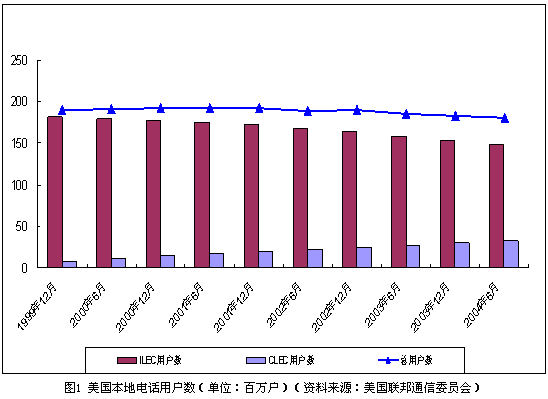 就整體而言,美國本地電話用戶總量穩(wěn)中有降,移動通信的替代作用開始顯現(xiàn)。截止到2004年6月,包括住宅和商業(yè)用戶,美國本地電話用戶總量達(dá)到1.81億戶。但與3年前相比,美國本地電話用戶數(shù)量實(shí)際減少了近1200萬戶。與此同時,移動用戶數(shù)量迅速增長。截止到2004年6月,美國移動電話用戶數(shù)比上年同期增長13%,達(dá)到1.673億戶,基本接近固定電話用戶的數(shù)量。