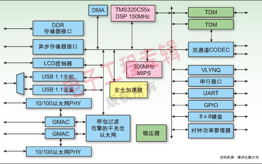 德州儀器(TI)公司最新的VoIP處理器設(shè)計(jì)用于確保在中小企業(yè)應(yīng)用中提供無(wú)延遲的語(yǔ)音服務(wù)。這種名為T(mén)NETV1051的處理器集成了1個(gè)300MHz的MIPS處理器、1個(gè)150MHz的C55x數(shù)字信號(hào)處理器(DSP)、2個(gè)千兆位以太網(wǎng)(GbE)媒體訪(fǎng)問(wèn)控制器(MAC),以及1個(gè)片內(nèi)GbE交換器。